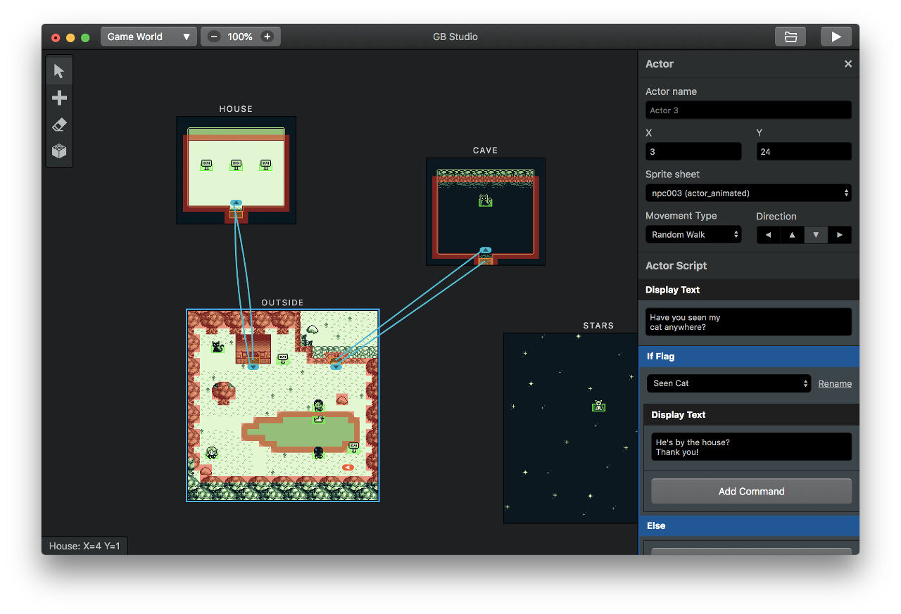 『GB Studio』というオープンソースのソフトで、Windows、Mac、Linux版が公開されている。