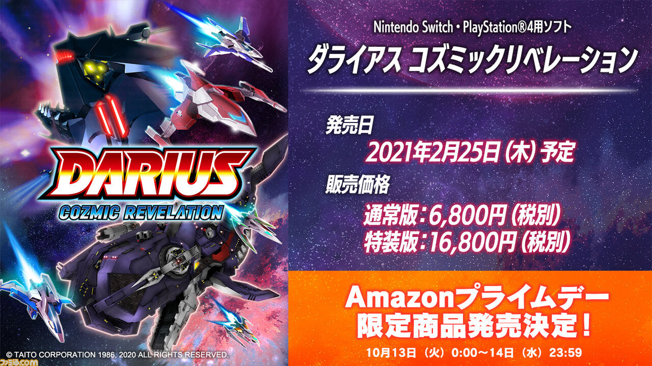 | Switch/PS4『ダライアス コズミックリベレーション』が2021年2月25日発売決定! Amazonプライムデー限定商品の発売も - ファミ通.com Switch/PS4『ダライアス コズミックリベレーション』が2021年2月25日発売決定! Amazonプライムデー限定商品の発売も ファミ通.com (出典:ファミ通.com) |