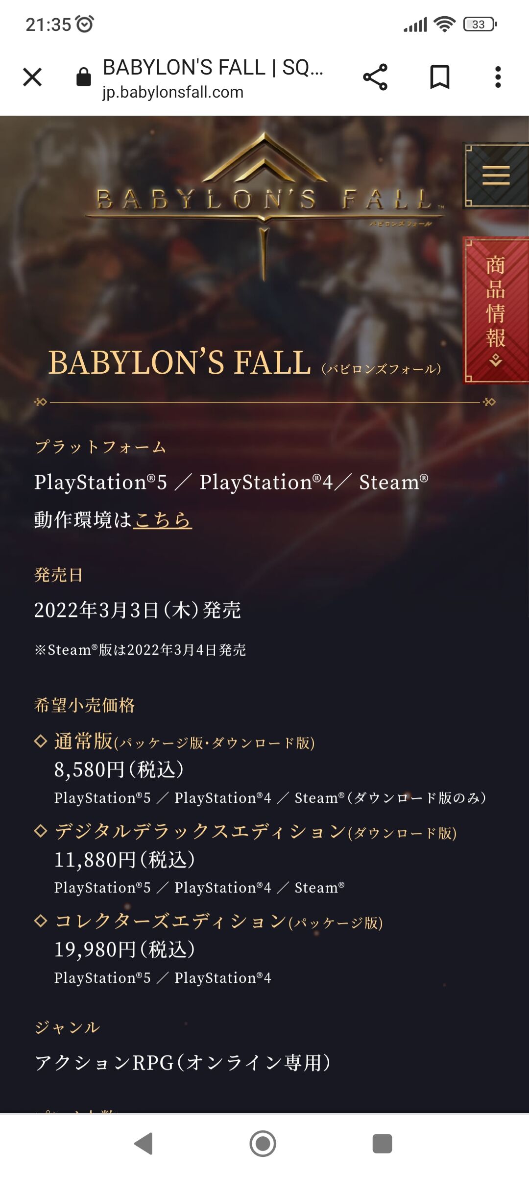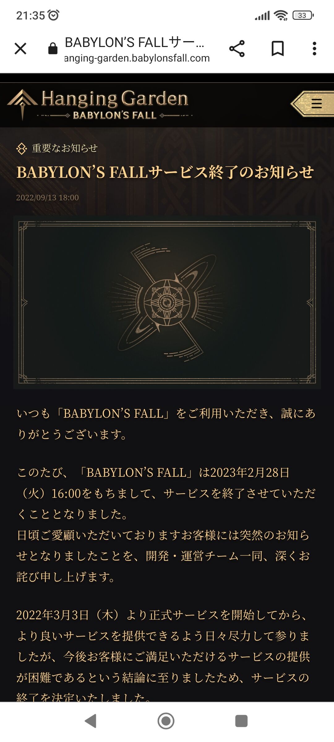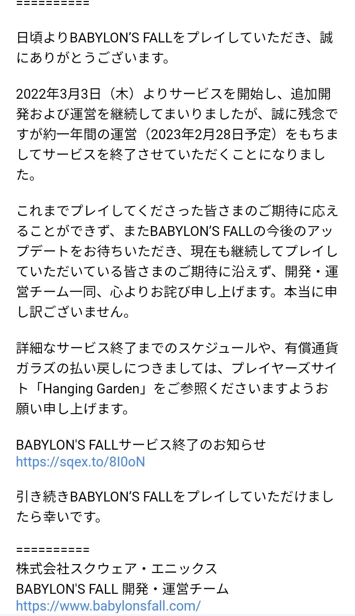 重要なお知らせ BABYLON’S FALLサービス終了のお知らせ